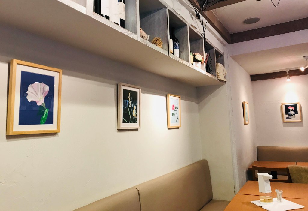 世田谷八幡宮近くの南フランス料理店で、「はり絵」の新作5点を展示しました。